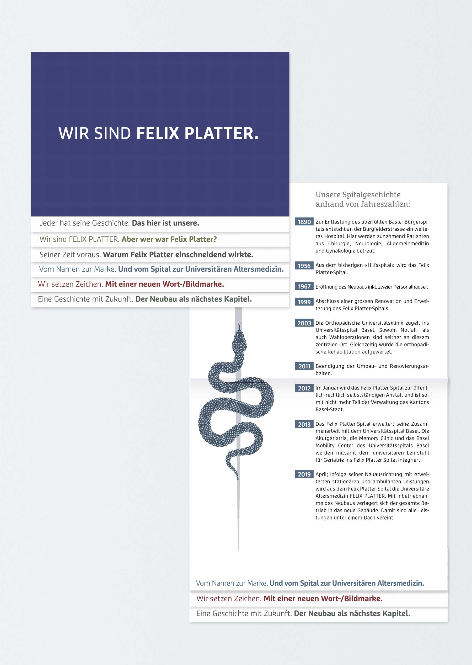 Das Felix Platter Spital gehört zu den führenden Universitären Zentren für stationäre und ambulante Altersmedizin in der Schweiz. Gleichzeitig zum Umzug des Felix Platter Spital in den Neubau, wurde der visuelle Auftritt neu gestaltet. Um die Wiedererkennung zu garantieren, sollte dieser moderne und zielgruppengerechte Akzente setzen.